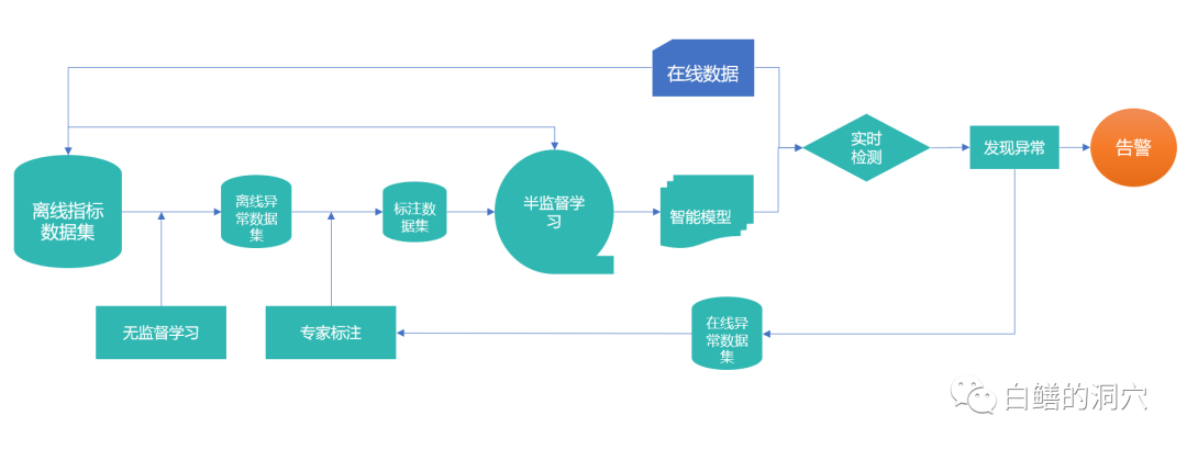 利用离线数据,通过暴力计算获得异常数据集,然后有专家完成部分异常数据集的标注工作,进行半监督学习,形成模型,用于在线指标异常检测。发现异常后,形成在线异常指标集,由专家进行部分标注后,再次反馈到半监督学习中,不断迭代优化智能模型。经过几个周期的迭代,模型的质量会逐步提高。
