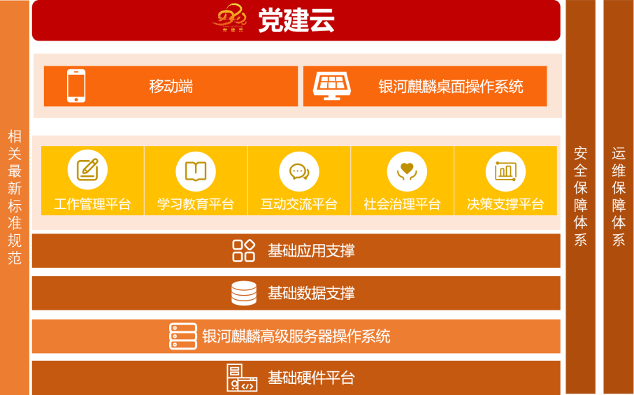 基于银河麒麟高级服务器操作系统V10的党建云在智慧党建应用领域紧贴中央政策,覆盖党组织范围广,服务党员数量众多,目前已经在多个大型党建平台成功应用。