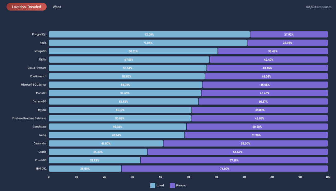 最流行的数据库反映了当前的现状,而开发者的喜爱则代表未来。在此项中,PostgreSQL第一次击败Redis,成为最受开发者喜爱的数据库!(在所有数据库中!)