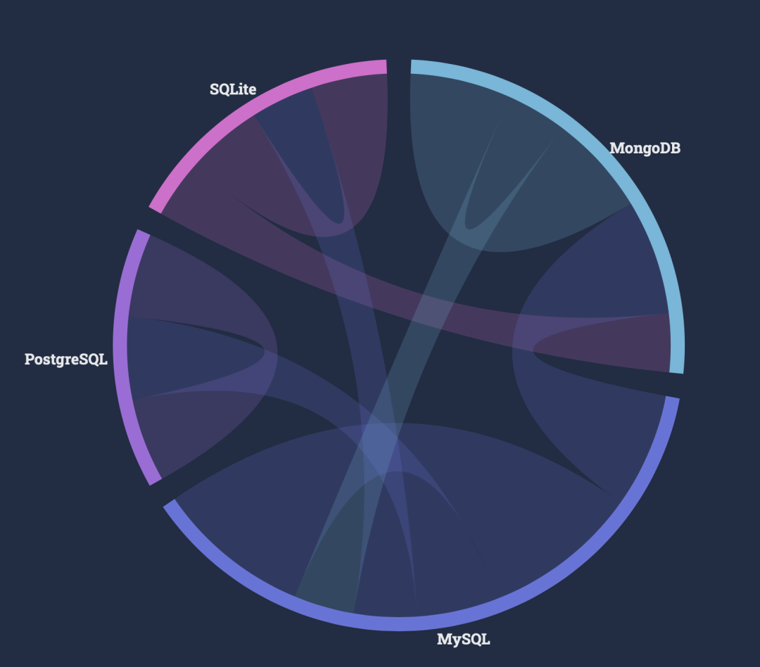 根据用户过去一年在用的数据库类型与下一年准备用的数据库,Stackoverflow绘制了数据库流向和弦图。它反映了某个数据库的用户群体,对什么样的数据库感兴趣。
