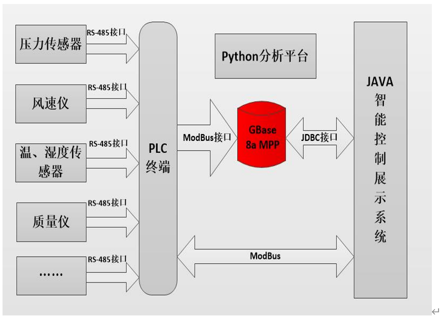 解决方案配套GBase 8a MPP cluster V9版本单节点部署以满足系统数据分析需要,配合设备自带传感器及配套开发的ModBus数据接口采集数据系统架构图如下:
