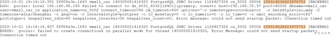 常见的连接报错例如: 2020-01-09 16:57:17.853 5e16eab1.7933 test_1226 281467863168624 gsql 0 cn_5001 08006 72620544030096250 [BACKEND] ERROR: pooler: failed to create connections in parallel mode for thread 281467863168624, Error Message: pooler: failed to connect to dn_6009_6010:wait 172.31.17.4:45138:dn_6009_6010 timeout expired 从日志中可以得到几个关键信息: