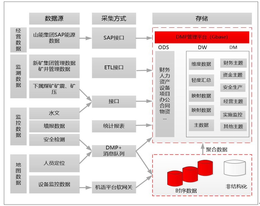 因此,GBASE南大通用给出的解决方案是利用南大通用大规模分析型数据库集群产品GBase 8a MPP作为集团大数据中心的核心数据平台,同管理信息化系统进行集成,采集大量的关系型数据。经营数据、监测数据、监控数据、地图数据通过接口汇聚进入GBase 8a MPP,满足新矿集团全部数据“统一采集、统一存储、统一管理、统一运营、统一服务”的需求,为集团公司及其权属单位提供全栈大数据服务,包括技术平台、数据应用及分析、数据服务等。