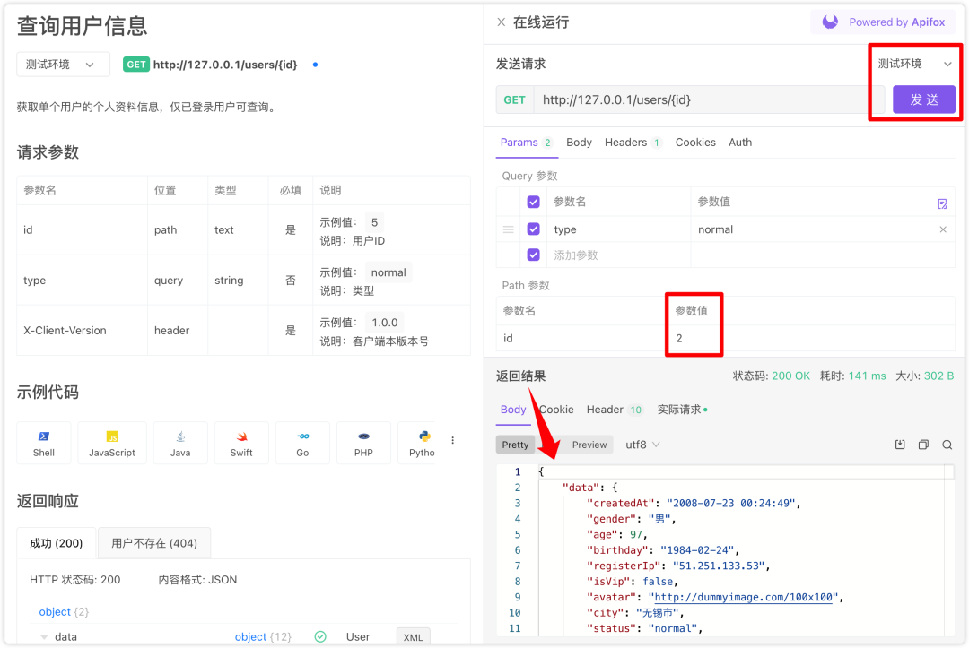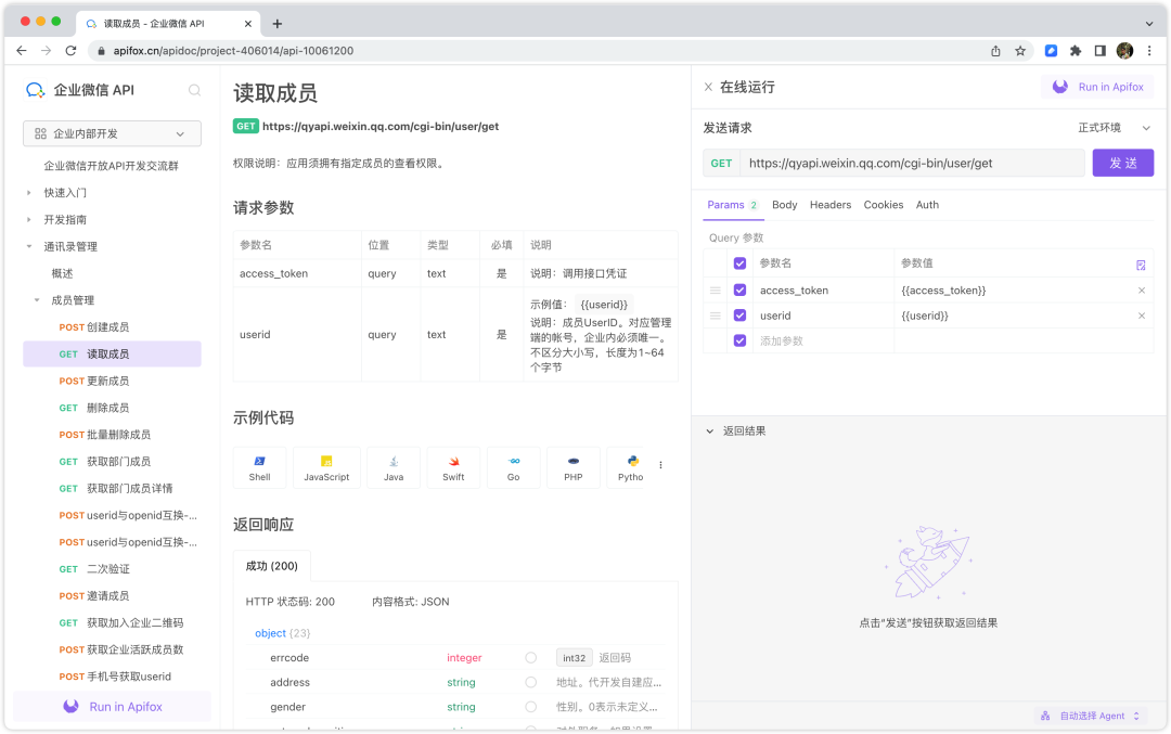 这个界面上就能直接调试接口了!直接 1. 填参数,2. 选环境,3. 点发送,接口请求就发出去了!下面就有返回结果!根本用不着 Postman!更不用把 API 照着抄一遍!