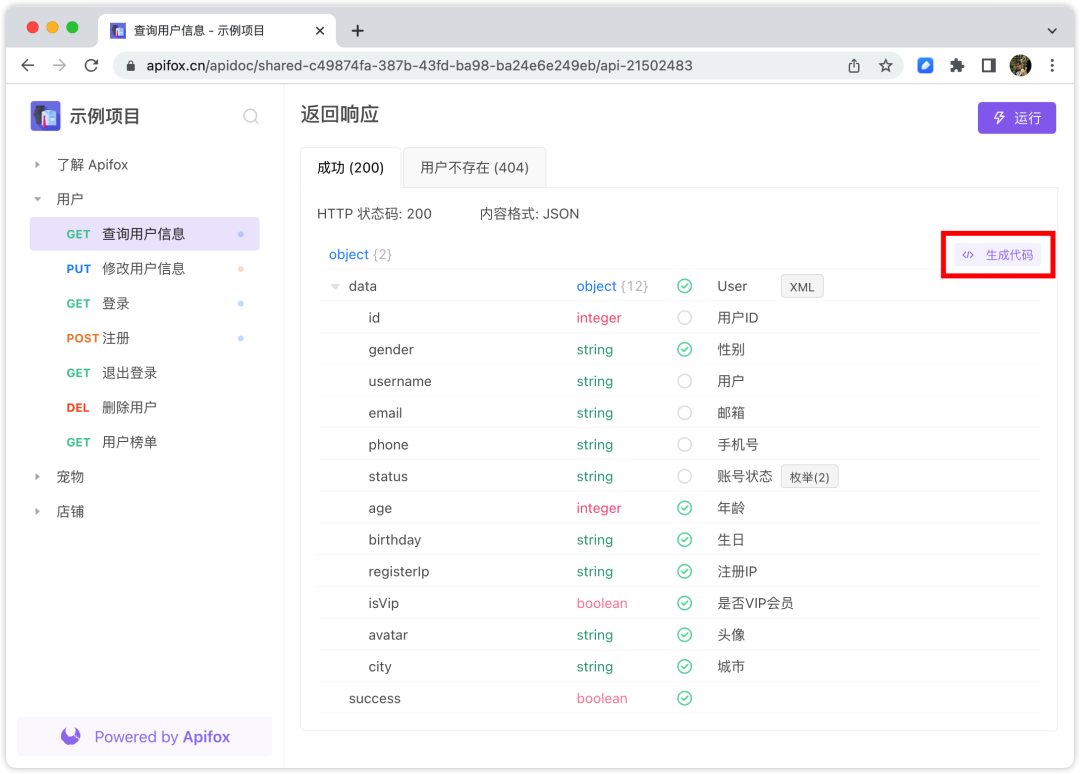 在这个神仙文档里呢,“返回响应”里也有个“生成代码”。