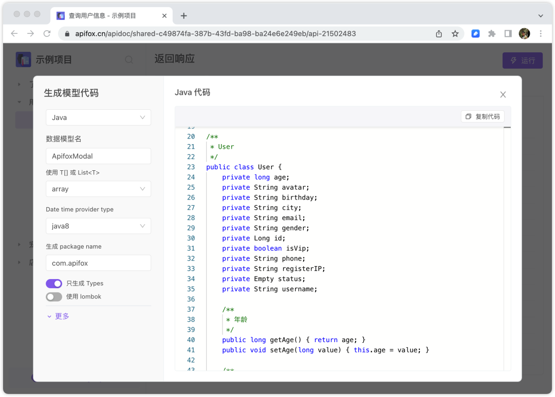 左边还可以选择你生成代码的配置,包括:编程语言、命名风格、校验开启等等。