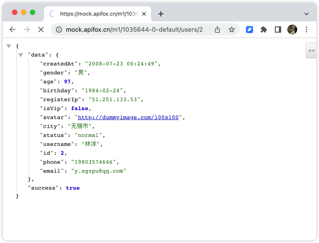 老大又用浏览器打开了这个 URL(https://mock.apifox.cn/m1/1035644-0-default/users/2),说你看,直接访问 URL 就能获取到 Mock 数据了,你们前端用起来是不是很爽?
