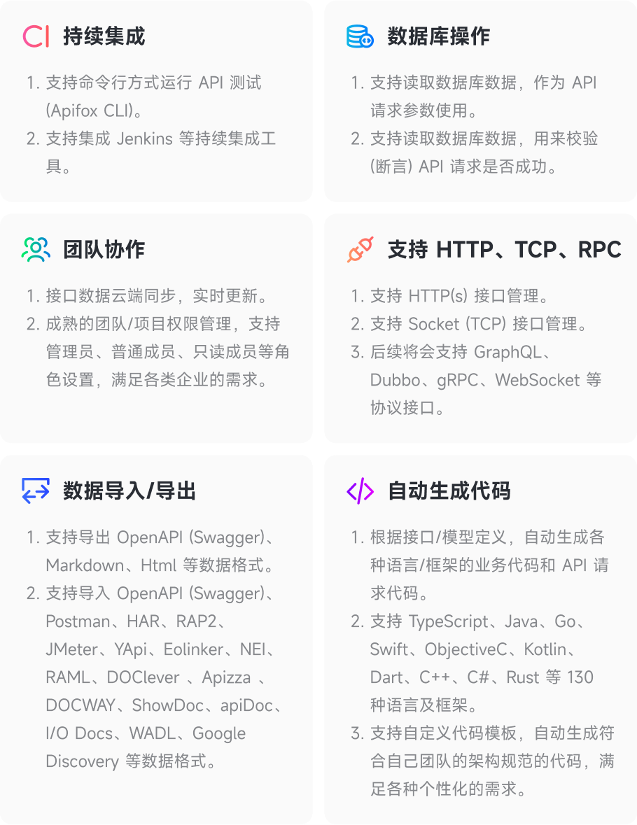 在这些核心功能之外,Apifox 还提供了大量创新的围绕 API 的扩展特性,适合各种规模的开发团队使用。