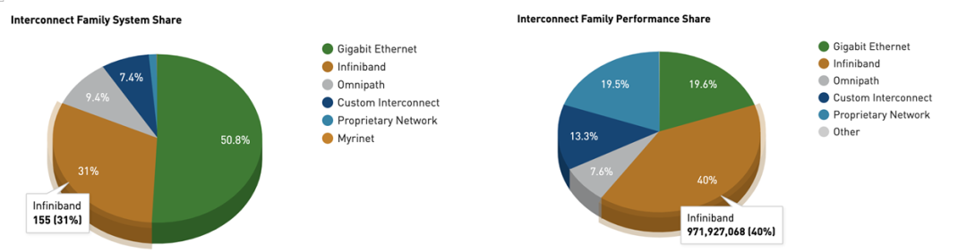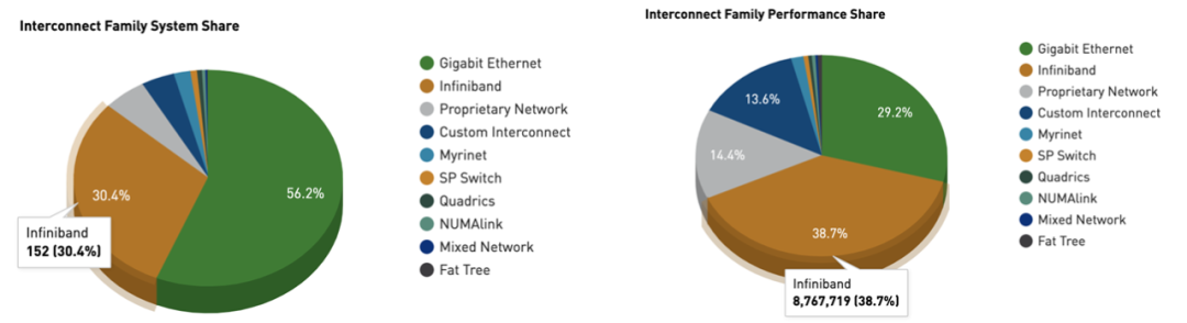 2020年11月,根据最新的第56版,155个使用 InfiniBand,并提供40%的算力,排名前10的超算集群有8个由 InfiniBand 构建,更是占据了前5的4席位置。