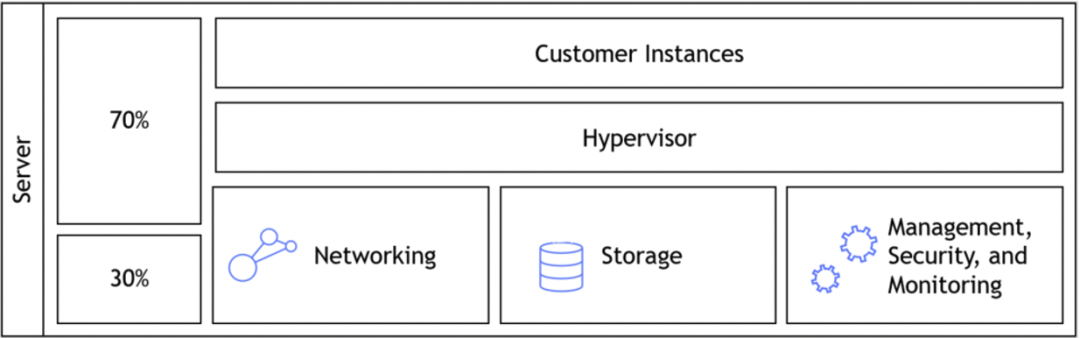 云计算催生超大规模数据中心,也同时放大通用算力的不足和异构计算的优势。就好比研发团队规模变大的同时必然走向专业化。AWS EC2早期由纯软(也意味着需要消耗CPU)的Xen对CPU、存储和网络完成虚拟化。基于这种实现方式,一个EC2实例的虚拟化管理开销高达30%。