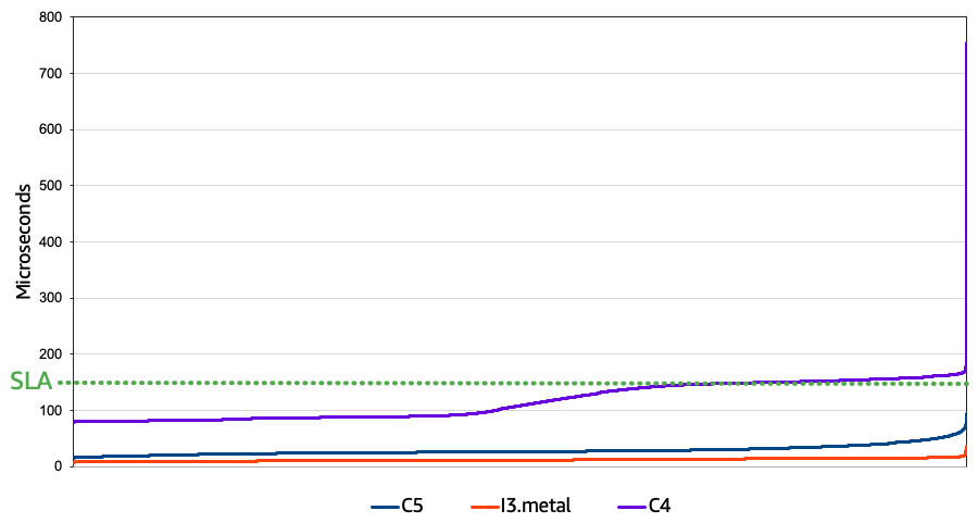 对客户而言,意味更好的性能和价格,下图可以看到基于Nitro的C5和I3.metal的延时明显降低: