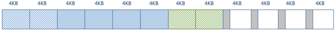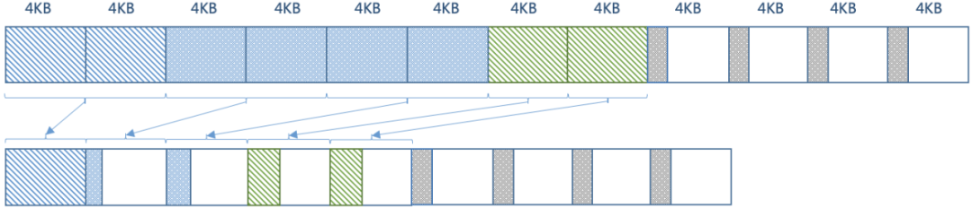但现有的空间管理实践会占用更多的物理空间,首先写入时需要按照文件系统页对齐写入(假设4KB),占用物理空间为48KB,数据存储分布如下图所示: