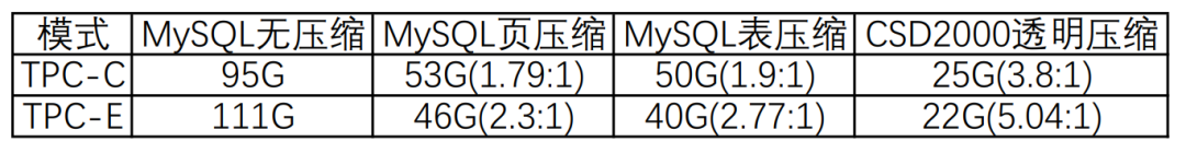 对比“软”压缩(基于CPU)和硬压缩(基于FPGA)两者的收益并不复杂,下面以MySQL为例,将MySQL页压缩,MySQL表压缩和CSD2000透明压缩三者进行对比,采用TPC-C和TPC-E数据集和负载模型,以压缩率和数据库性能(TPS和时延)为指标衡量压缩效率。