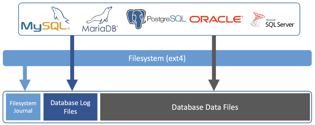 因为文件系统的 WAL(Write Ahead Log)机制,加上日志的稀疏结构,日志写入量占整体写入量20%~90%,可见文件系统日志写入量可能大于上层应用(数据库)的数据写入量;