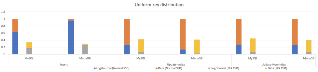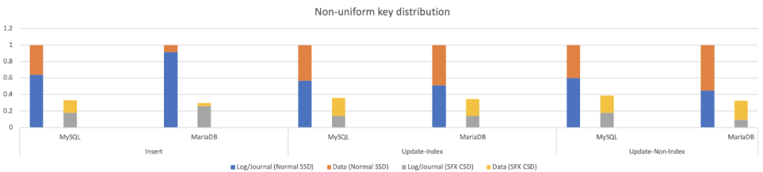说明:以普通NVMe SSD指标为基线做归一化,直方图面积越小,数据写入量越少。