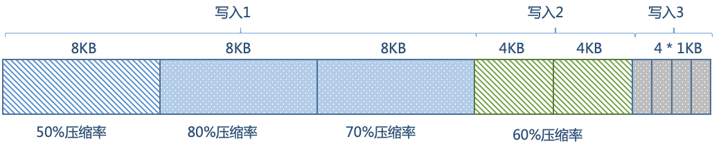 从一个常见的场景出发,应用多次写入压缩率各不相同的数据,逻辑写入量为36KB,如下图所示: