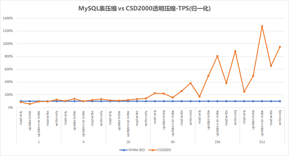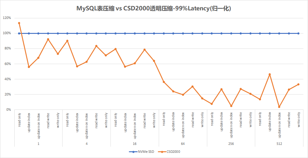 <64并发时,CSD2000 QPS/TPS普遍高于普通NVMe SSD 20%~50%,99%平均时延降低8%~45%;
