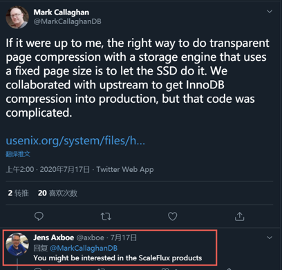 Mark Callaghan (Facebook Distinguished Engineer)曾经吐槽在数据库中实现透明页压缩并应用在生产环境,工程实现过于复杂,难怪Jens Axboe(Linux内核代码主要贡献者之一,FIO和IO_URING的作者)建议他把这些工作丢给计算型存储公司 ScaleFlux。而从计算型存储带来的压缩及性能(详见:可计算存储:数据压缩和数据库计算下推)收益来看已经超额完成任务。