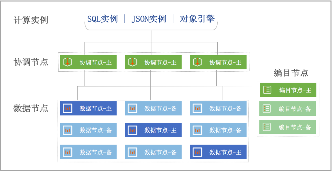 计算实例:负责接收应用端的访问请求,并将其转换成巨杉数据库特有的语法协议。计算实例支持多种引擎,如SQL引擎、JSON引擎、对象存储/文件系统引擎等。
