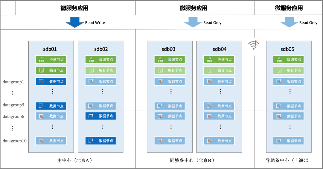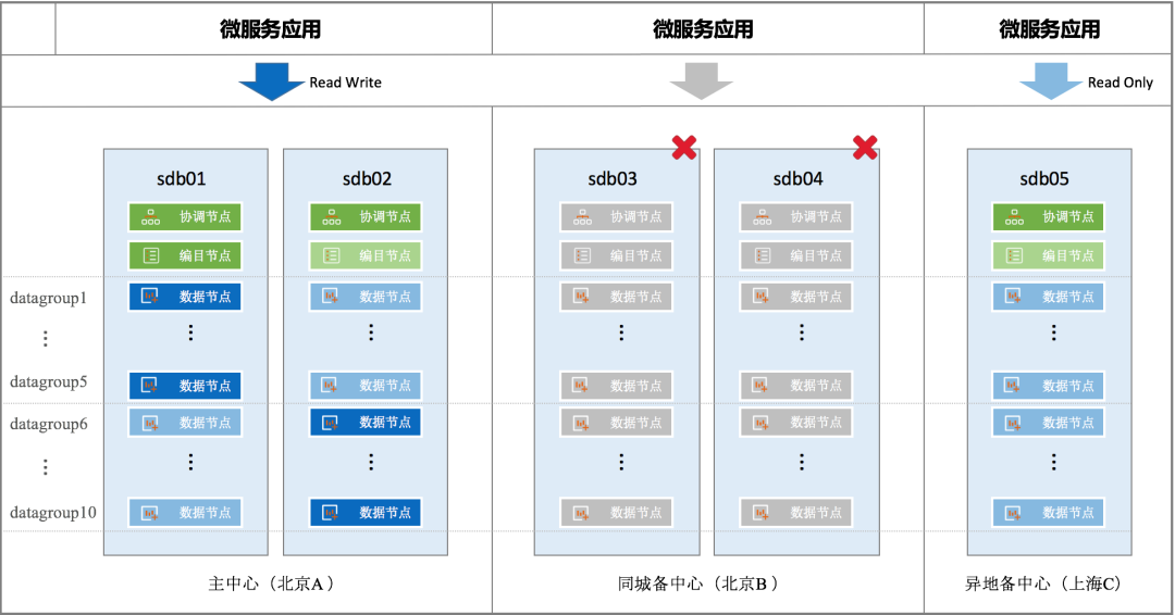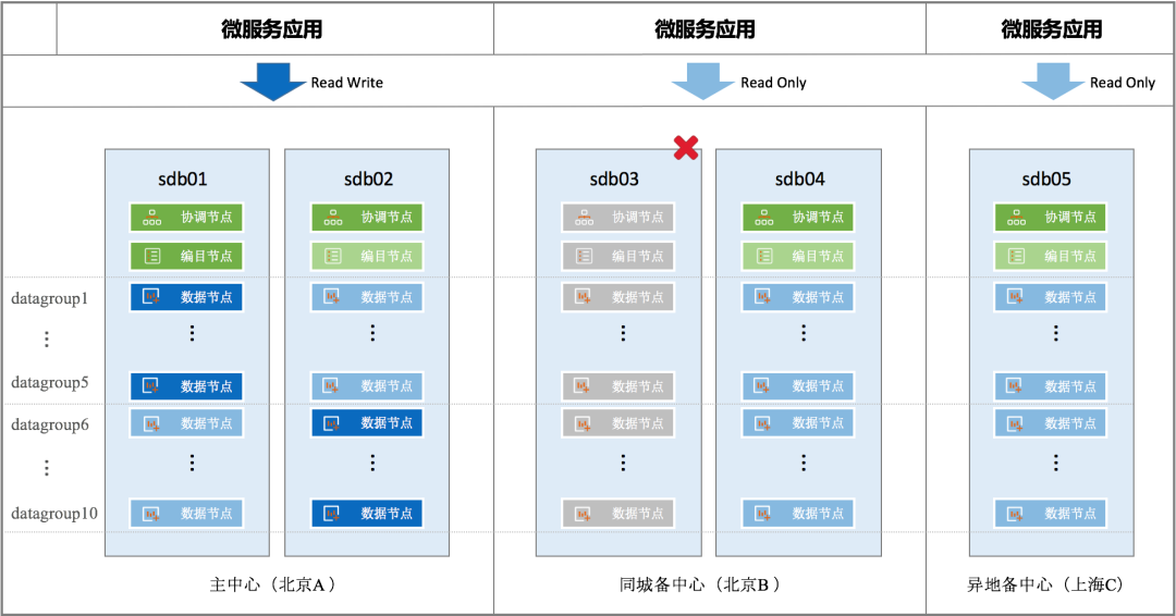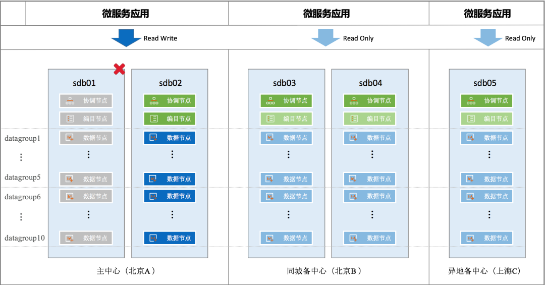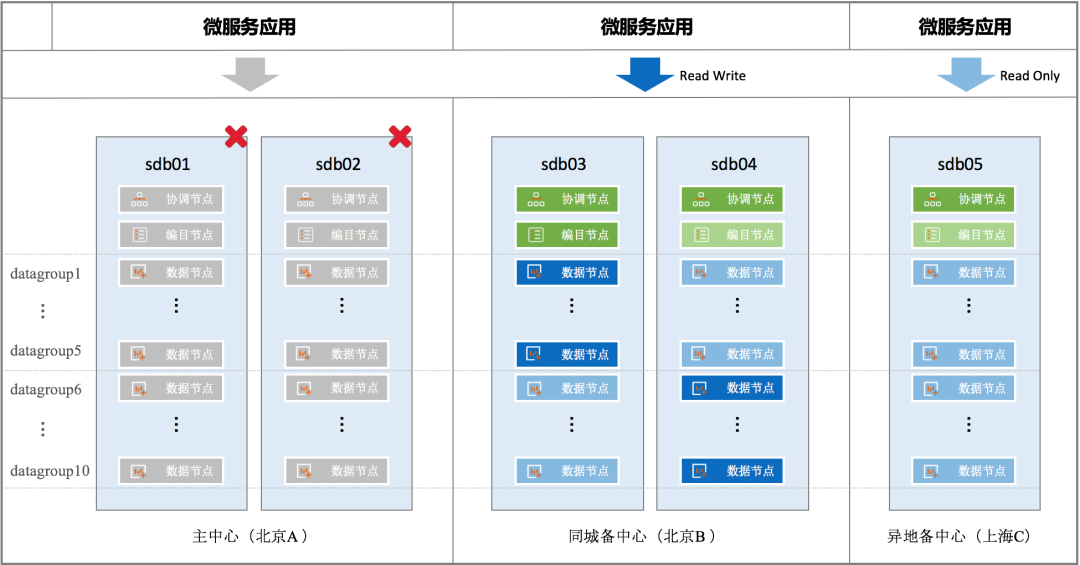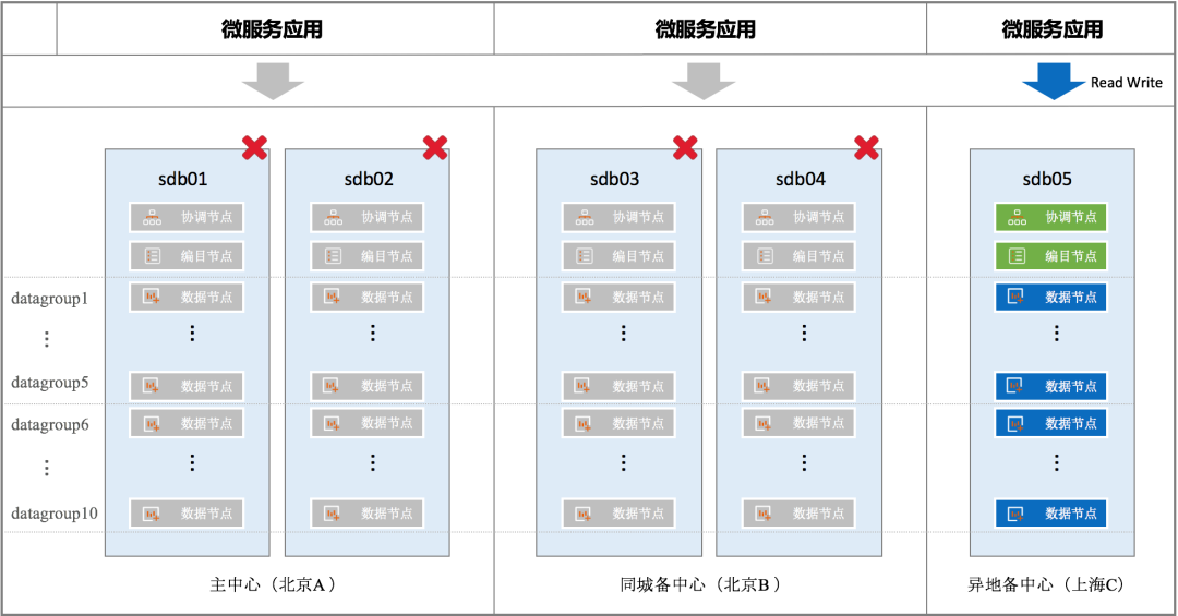 当主中心、同城备中心(sdb01/sdb02/sdb03/sdb04)同时不可用,就需要由异地灾备中心来承载业务访问。例如发生城市级的不可抗力故障时,就属于这种情况。