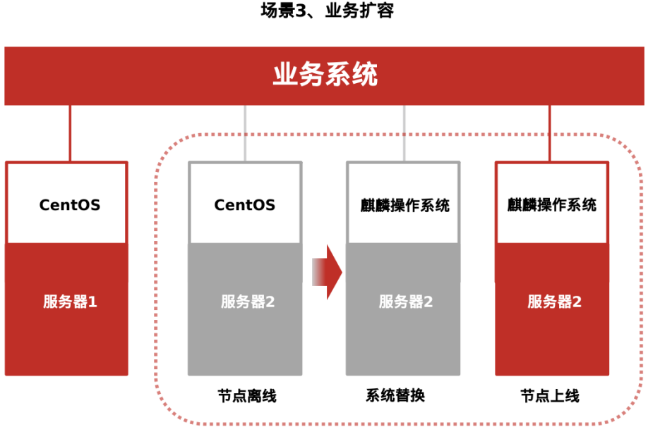 在业务系统不变的场景下,麒麟软件提供借助迁移工具达成操作系统兼容过渡的迁移方案,实现原有硬件利旧,完成操作系统平滑迁移。