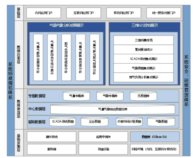 以数据资源层为基础,面向西青经济开发区燃气公司提供气量气象数据信息资源和应用服务支撑,主要包括气量气象分析成果展示和三维GIS综合展示子系统。