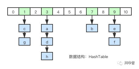 如图所示,哈希表是数组+链表的二维数据结构,数组是第一维,链表是第二维。数组中的每个元素称为槽或者桶,存储着链表的第一个元素的指针。在上图中我们一共有11个槽,现在我们有a-h共8个key需要存储,我么会使用哈希函数对每个key值生成纯数字的摘要,然后将数字对11取模,这样就能够确定该key值应该放在哪个槽中。当多个key值的摘要取模后相等时,就会使用链表进行串联依次存储key值,这种情况称为散列冲突,也叫碰撞。