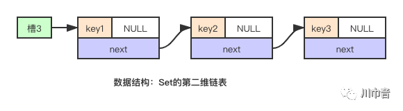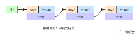 这样,当我们需要取某个key时,只需要对这个key进行重新hash得到摘要,然后取模就能知道它在哪个槽里了,然后通过链表的遍历依次匹配,就能得到指定的key,进而取得value。