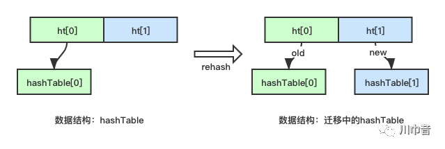 也就是所有的字典结构内部首层是一个数组,数组的两个元素分别指向一个哈希表,正常情况下只有一个哈希表,而在迁移过程中会同时保留新旧两个哈希表,元素有可能存在于两个表中的任意一个,因此会同时尝试从两个哈希表中查找数据。当数据搬迁完成后,老的哈希表就会被自动删除。