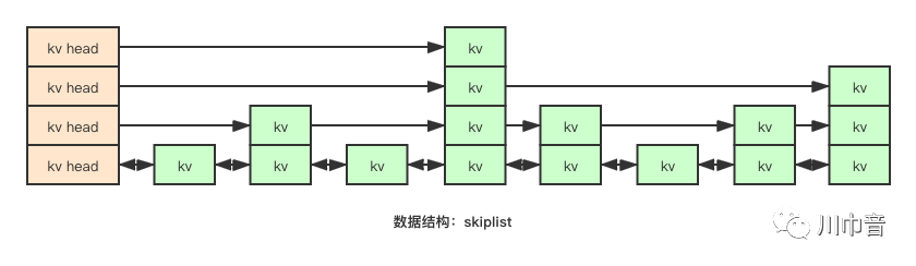 上图中每一列代表一个元素,从左到右score值越来越大,最左侧的kv head代表起始位置,score值为MIN_VALUE。最底层用双向链表串联,用于反向遍历,元素的二层以上会有指向下一个同层高元素的单向指针。