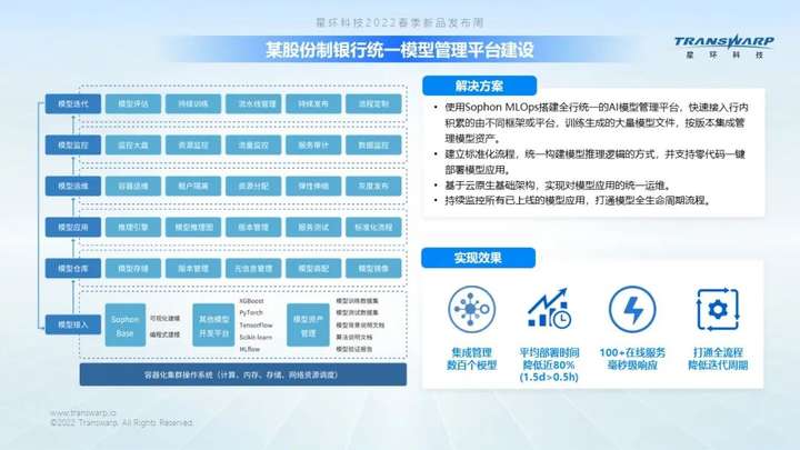 Sophon Base 3.1使用MLOps搭建了全行统一的AI模型管理平台,快速接入行内积累的不同框架或平台训练生成的大量模型文件,按版本集成管理模型资产;并建立标准化流程,统一构建模型推理逻辑的方式,支持零代码一键部署模型应用。基于云原生基础架构,打通模型全生命周期流程,实现了银行对模型应用的统一运维和监控。