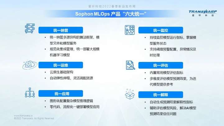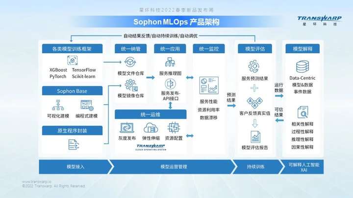 为解决AI落地难的问题,星环科技的AI团队从用户需求端出发,倾力研发了一款基于云原生架构的企业级AI能力运营平台Sophon MLOps,助推AI模型落地。Sophon MLOps 是基于云原生架构构建的企业级AI能力运营平台,聚焦于机器学习模型全生命周期中的模型管理、模型部署、模型监控预警、模型评估和模型迭代等关键环节。通过统一纳管、统一运维、统一应用、统一监控、统一评估、统一解释,赋予企业客户易用、高效且安全可靠的AI能力运营服务,协助客户规模化管理日益增长的机器学习模型,提升模型使用效率,降低模型集成管理成本,控制模型生产环境风险。