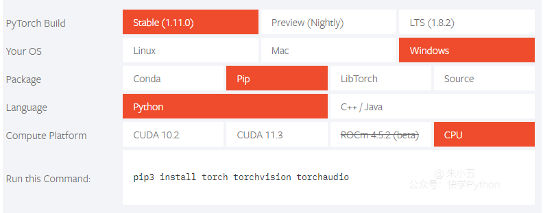 安装Pytorch会比其他库麻烦一些,如果去官方安装下载,需要根据实际配置得到适合自己的安装命令。