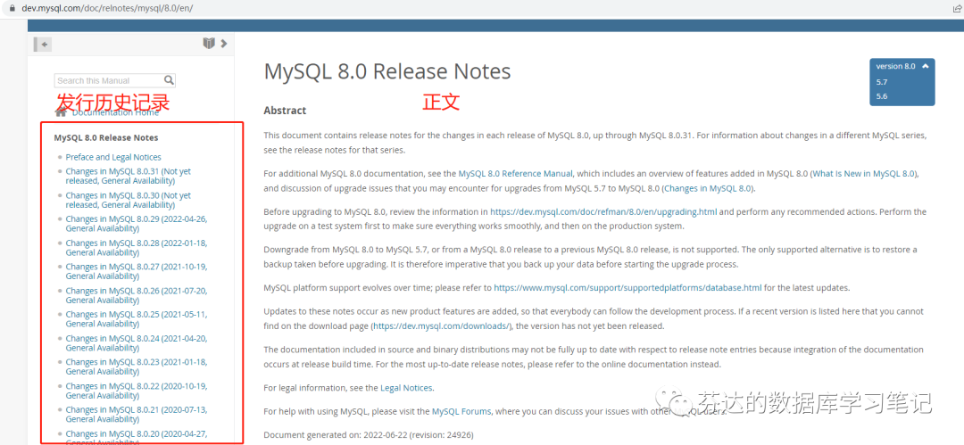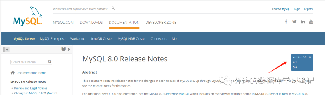 我们在右侧,可以更换查看不同发行版本的 Release Notes,目前我们可以查看 5.6、5.7、8.0 版本的发行版说明。