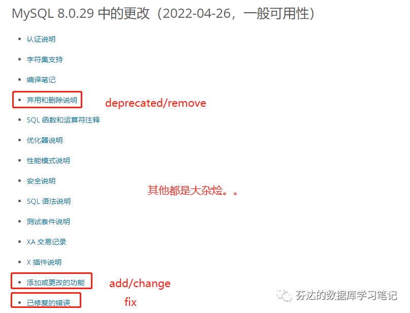 和我的分类不一样的是,MySQL 在 remove(移除) 一个功能前会先 deprecated (弃用),这个功能在版本 deprecated 的话,意味着官方不建议您继续使用了,在使用时为了兼容,依然能用,但会给你一个警告,提醒您这个功能将会未来版本被移除。