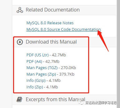 如果你依然想下载离线版,可以在网站左侧底部找到红圈这里下载,箭头那个是地址是"源码文档",没事别想不开点开,你会和我一样陷入初级 DBA 的无尽痛苦。