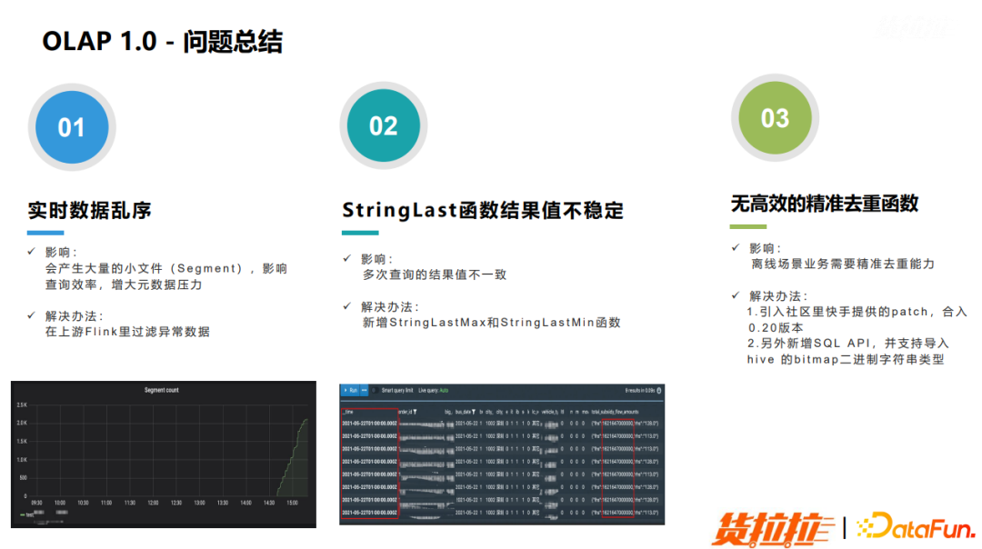 数据导入部分中,实时数据乱序为典型问题。 在数据准确性验证阶段发现 StringLast 的函数值不稳定。 Durid 没有一个高效的精准去重的函数。