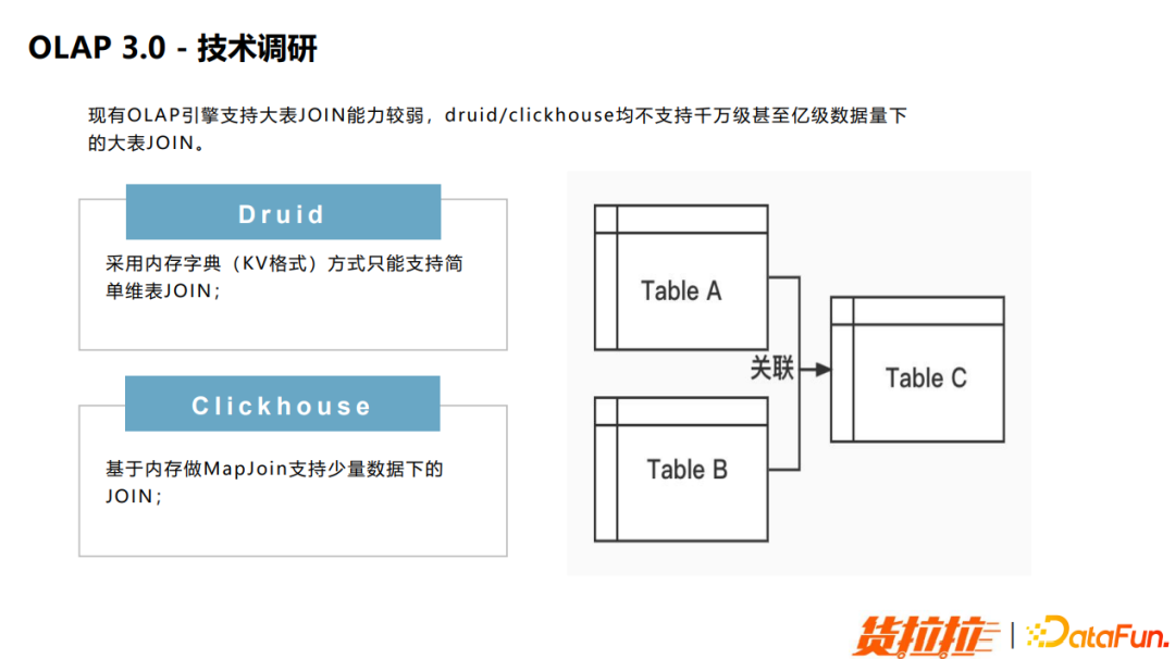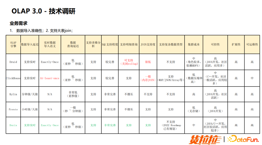 2021 年上半年为货拉拉的 OLAP1.0 阶段,这个阶段我们主要是支持公司的罗盘业务,我们引入的是能够提供较好的单表依据和查询能力的 Apache Druid 引擎。 2021 年下半年为货拉拉的 OLAP2.0 阶段,我们支持了智能定位工具,这个阶段引入了够提供单表明细查询,并且还有较高的压缩率 ClickHouse。 今年为货拉拉的 OLAP3.0 阶段,伴随着公司业务需求的不断增多,我们也会需要用到多数据源的关联分析。基于此,由于 Apache Doris 具备大表关联分析的能力,我们引入了 Apache Doris 引擎。