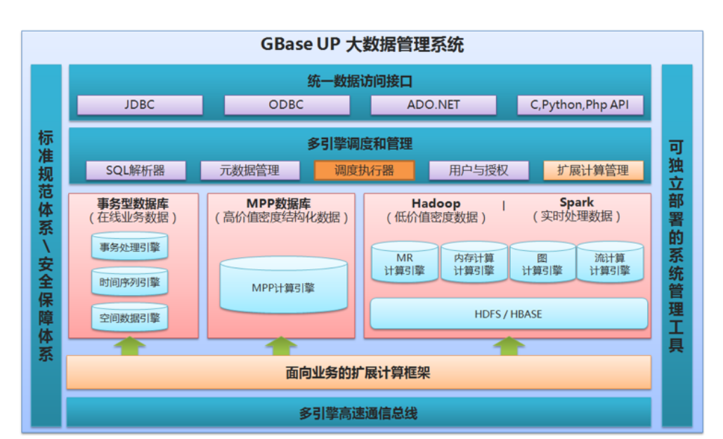 GBase UP以成熟的GBase 8a MPP商用数据库为基础,扩展出针对Hive & Spark、HBase、GBase 8s的计算和存储引擎,建立引擎之间高效数据交换通道,构建了对外统一,对内可扩展的集群数据库产品。