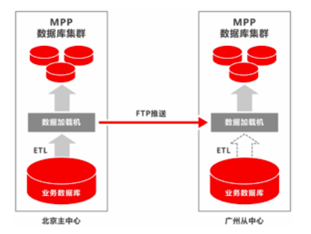 数据同步具体过程为:北京中心作为主中心进行数据抽取、清洗、转换等工作,生成新增数据文件并放置在该中心的MPP数据库集群的数据加载机上,加载机通过使用FTP推送功能将新增数据文件推送到广州中心的MPP数据库集群数据加载机上。作为从中心,对接收到的新增数据文件进行处理,实现两中心MPP数据库集群的数据同步。