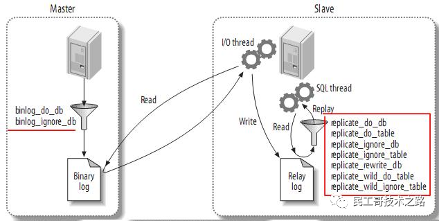 复制过滤可以让你只复制服务器中的一部分数据,有两种复制过滤:在master上过滤二进制日志中的事件;在slave上过滤中继日志中的事件。如下: