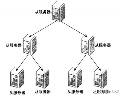 这种多层级联复制的架构,很容易就解决了Master端因为附属Slave太多而成为瓶颈的风险。下图展示了多层级联复制的Replication架构。