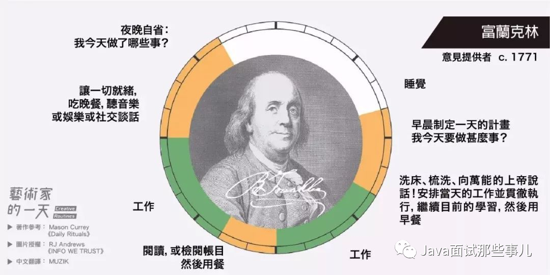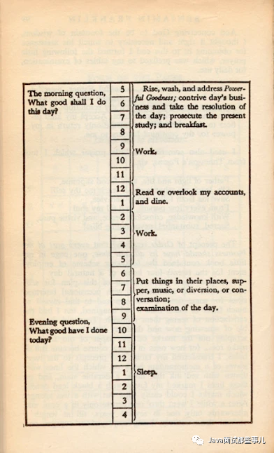 富兰克林的生活得很规律,他每天都有严格的时间表,他还在每天早上决定一个当天的目标,到了晚上会问自己今天一天都完成了些什么。