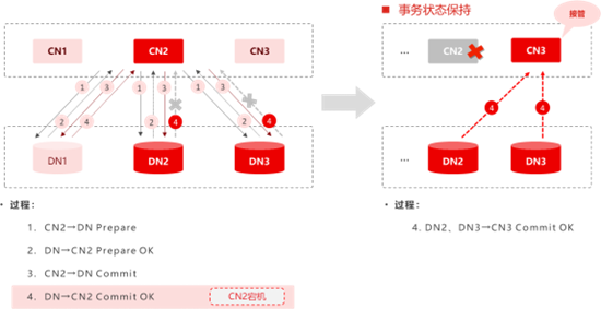 OK 状态且 DN2、DN3 还未完成 Commit OK 状态提交时,CN2 节点宕机;