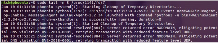 从上面的信息可以看到 PID 为 1141 的进程打开着该文件,文件描述符为 7,并且显示该文件已经被删除了。接下来我们通过 1141 号进程的文件文件描述符来查看该文件的内容: