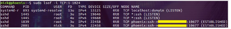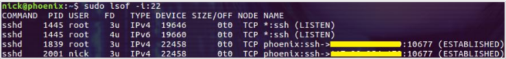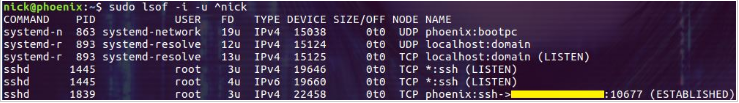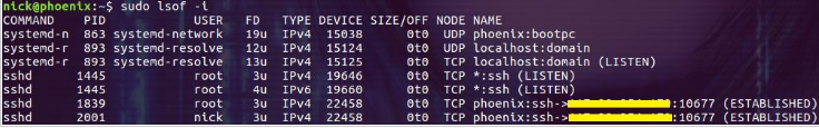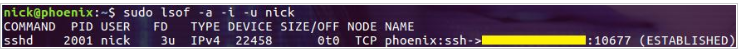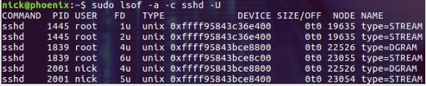 -U 选项输出打开的 UNIX domain socket 文件,这里我们结合 -c 选项来查看 ssh 服务打开的 UNIX domain socket 文件: