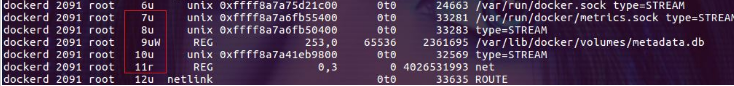 数字后面的字母表示进程对该文件的读写模式,比如上图中的 u 表示该文件被打开并处于读取/写入模式。除了 u,还有 r 表示只读模式,w 表示只写模式,还可以同时应用 W 表示该进程拥有对文件写操作的锁。下图是截取的 docker daemon 进程打开的文件列表,其中显示了 FD 的不同模式:
