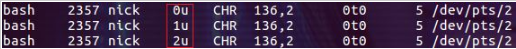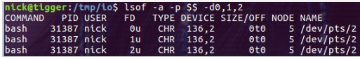 其中的 -p 选项指定了当前进程的 PID,而 -d 选项则用来指定进程打开的文件描述符(可以通过逗号分隔多个文件描述符)。添加 -a 选项后,结果输出为当前进程打开的文件描述符为 0、1、2 的文件。