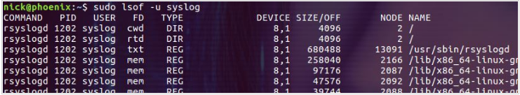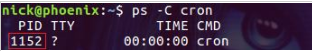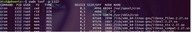 通过 -p 选项并指定进程的 PID 可以输出该进程打开的所有文件。比如我们想要查看 cron 程序打开的文件,可以先用 ps -C cron 命令查出进程的 PID: