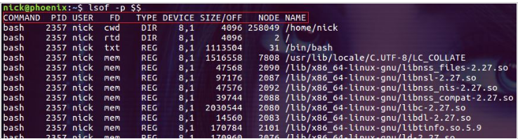 如果不带任何选项执行 lsof 命令,会输出系统中所有 active 进程打开的所有文件,结果就是我们被输出的信息所淹没,这没有任何的意义。我们先让 lsof 命令输出当前 Bash 进程打开的文件,并截取其中的一部分结果来介绍输出内容中都包含哪些信息: